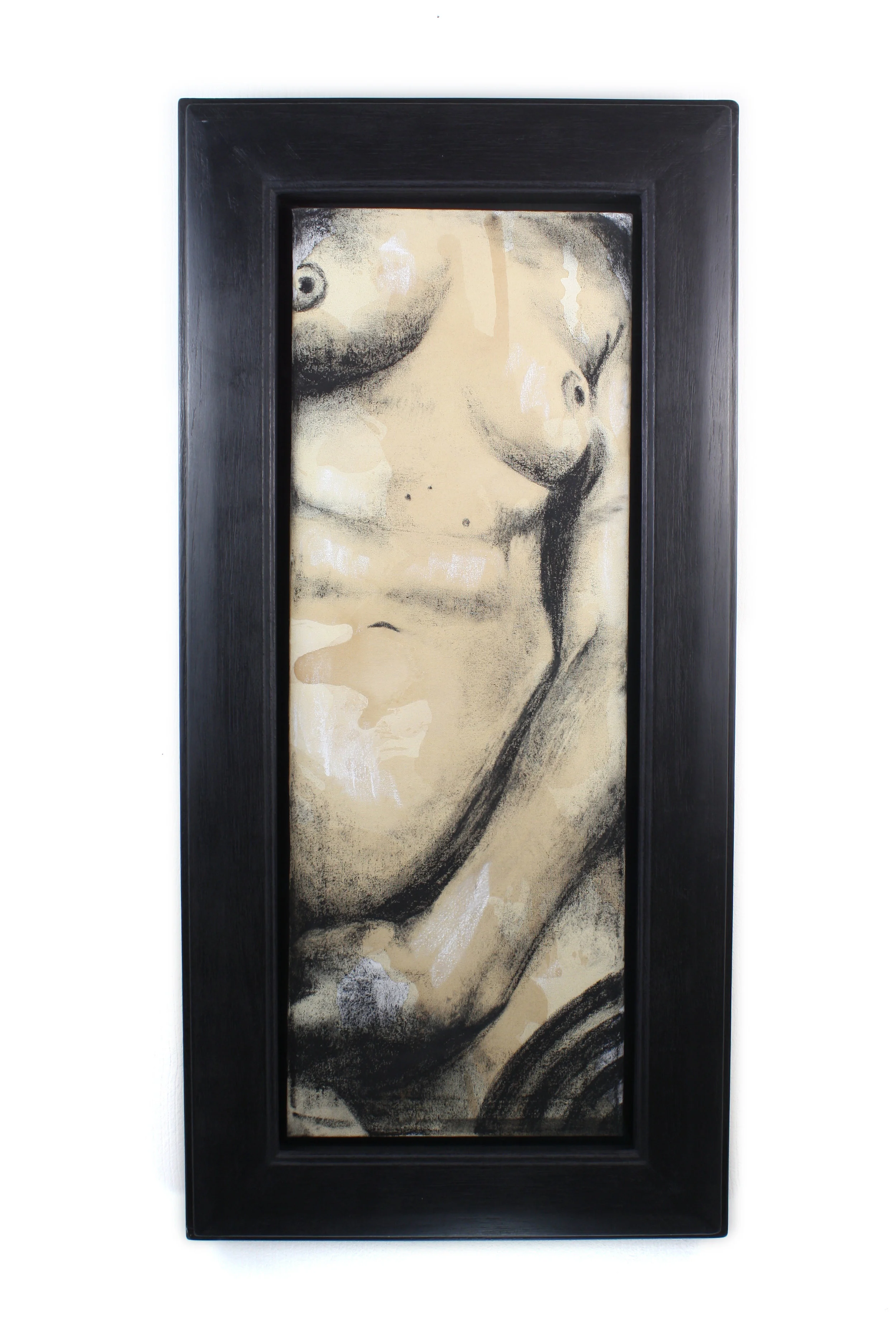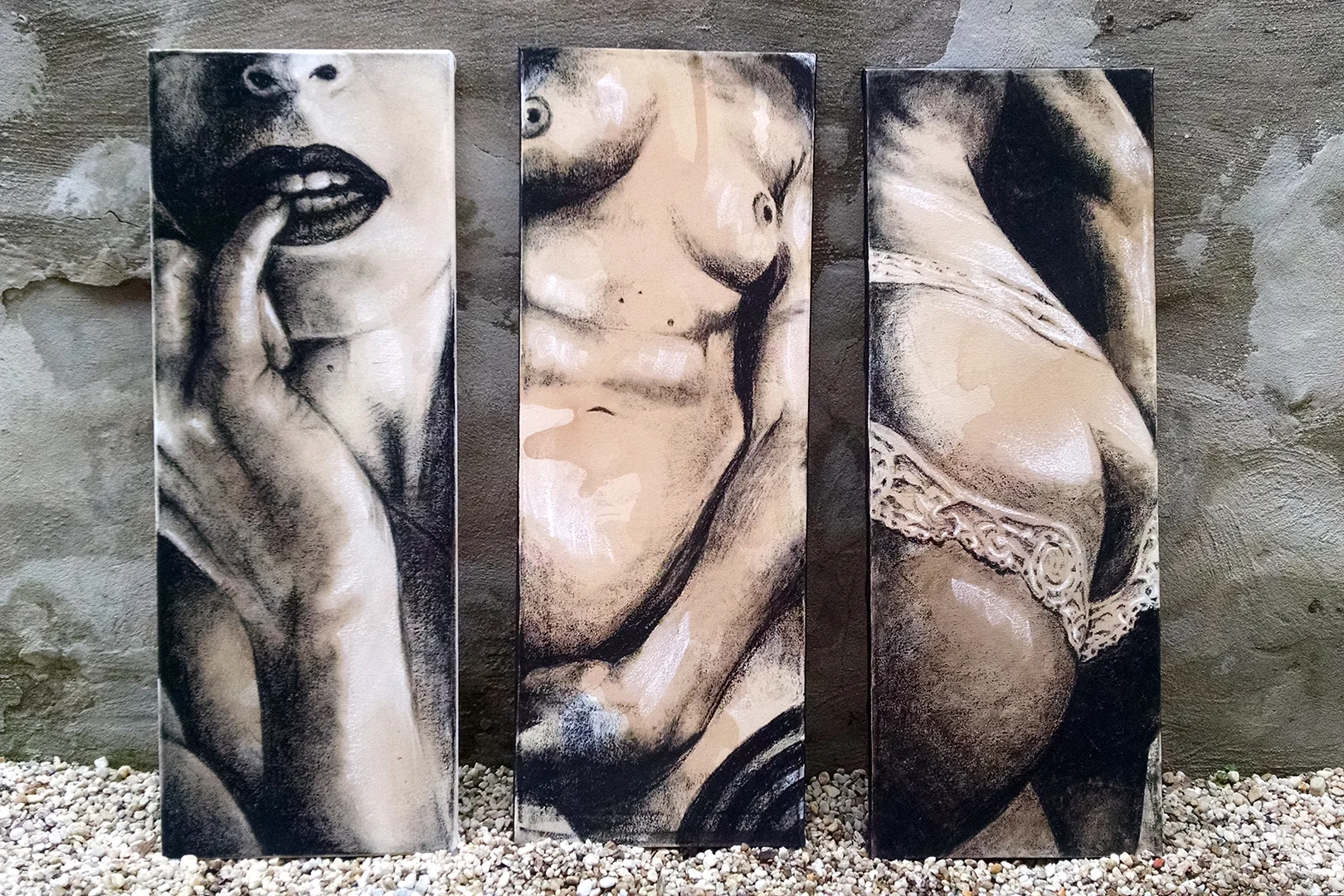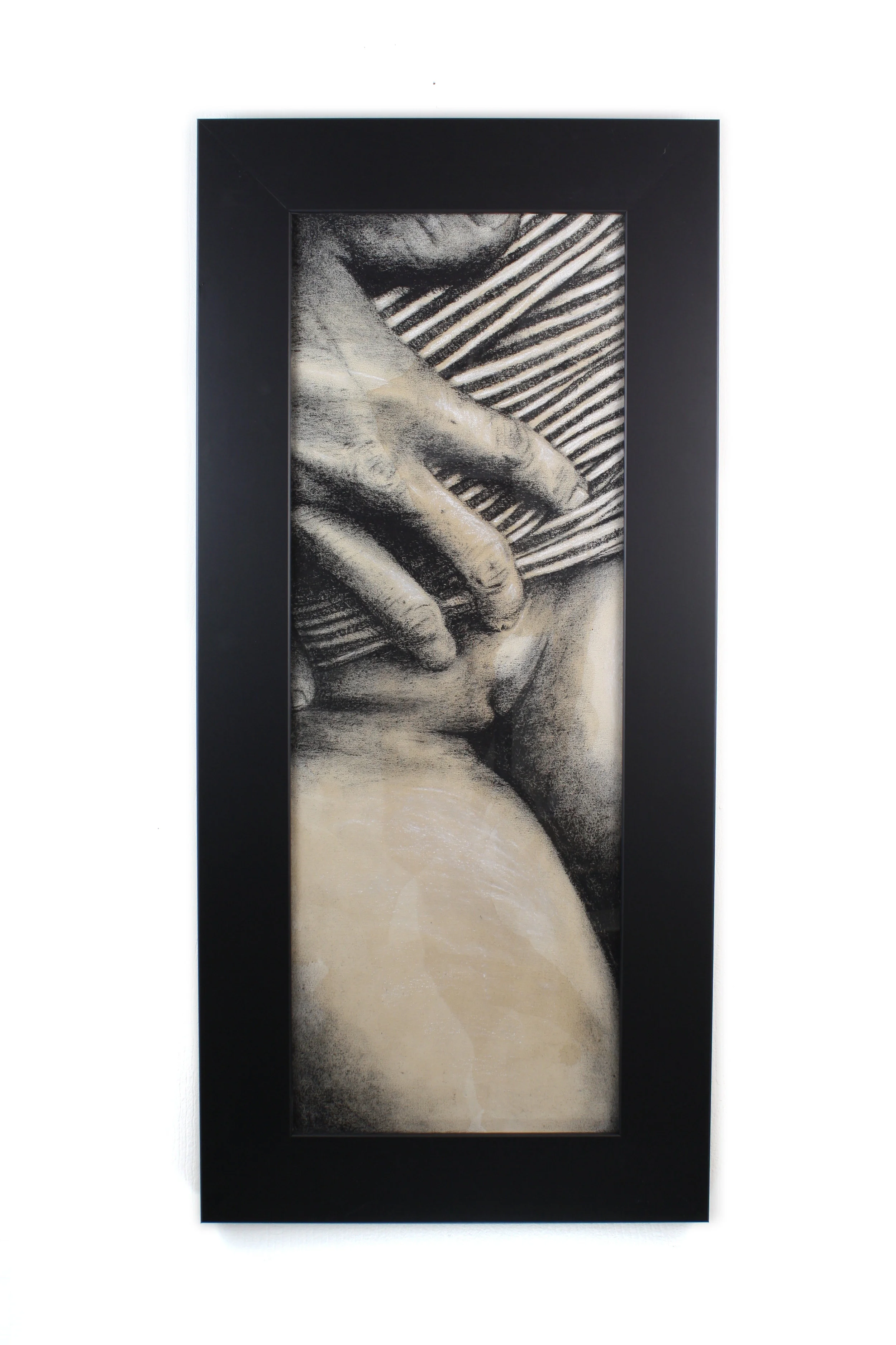 The charcoal series presents the female body as a canvas for comment and feedback. The drawings, based on mobile phone photos, are aesthetic reflections on a woman's body as an object of desire from her point of view. The project juxtaposes a disposable art form, the digital “selfie,” and the female figure on canvas as high art.